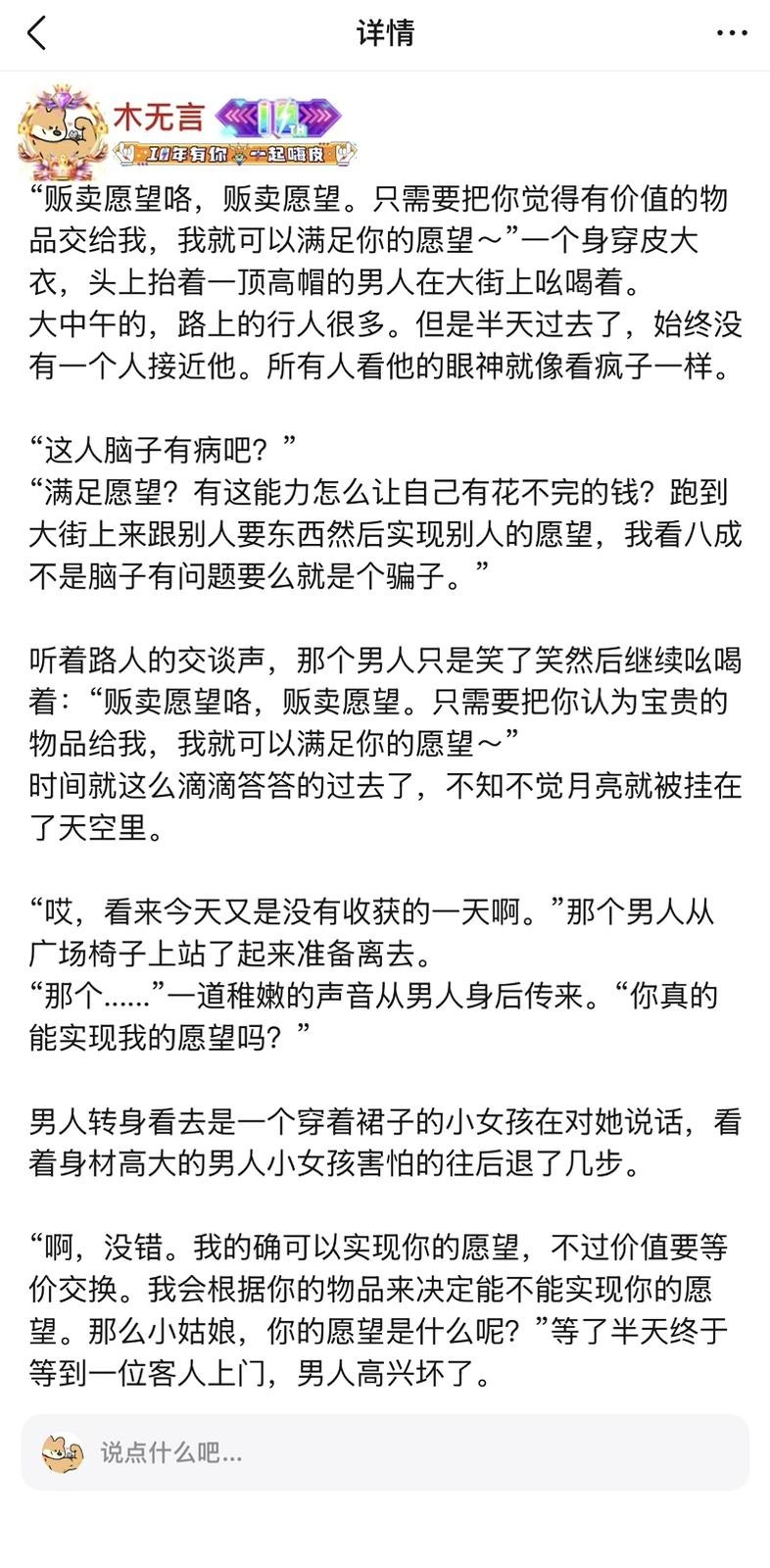 他一边走一边说:“贩卖愿望咯,贩卖愿望。只需要把你觉得有价值的物品交给我,我就可以满足你的愿望~”