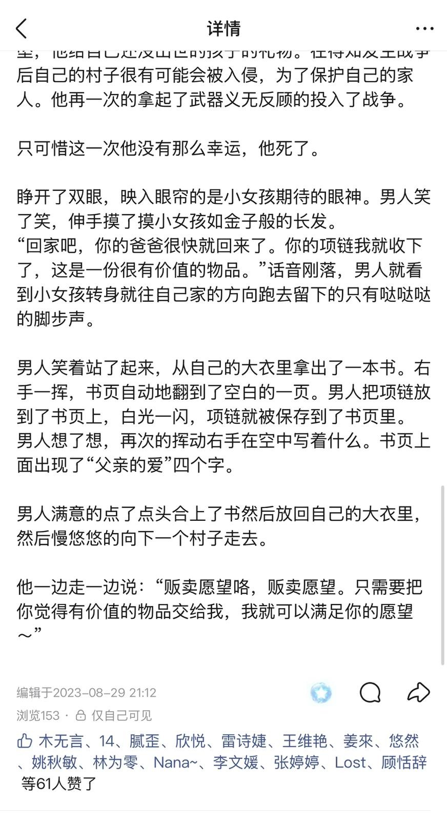 听着路人的交谈声,那个男人只是笑了笑然后继续吆喝着:“贩卖愿望咯,贩卖愿望。只需要把你认为宝贵的物品给我,我就可以满足你的愿望~”